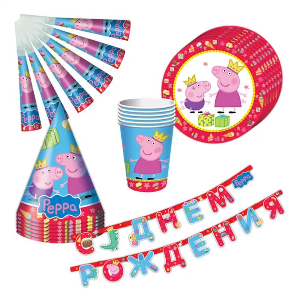 Все для праздника Свинка Пеппа в одном наборе! Набор рассчитан на 6 персон: 6 тарелок диаметром 23 см, 6 стаканов объемом 210 мл, 6 бумажных колпачков на резинках, 6 бумажных дудочек, 1 бумажная гирлянда с надписью «С Днем Рождения» длиной 2,5 м.