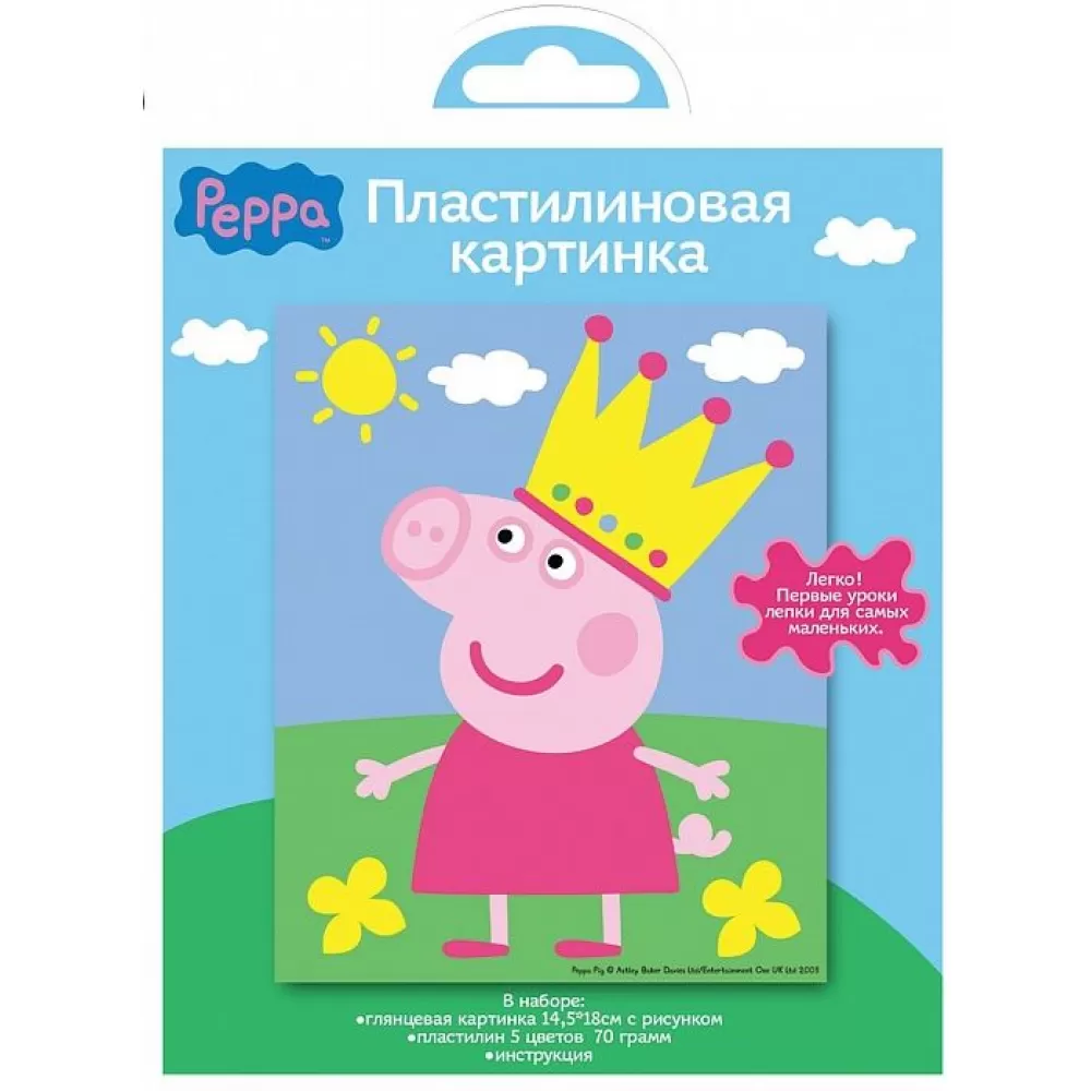 - В наборе «Свинка Пеппа» (Peppa Pig): 5 цветов мягкого, приятного на ощупь пластилина (70 г), глянцевая картинка размером 14,5х18 см с нанесенным рисунком, пошаговая инструкция.
