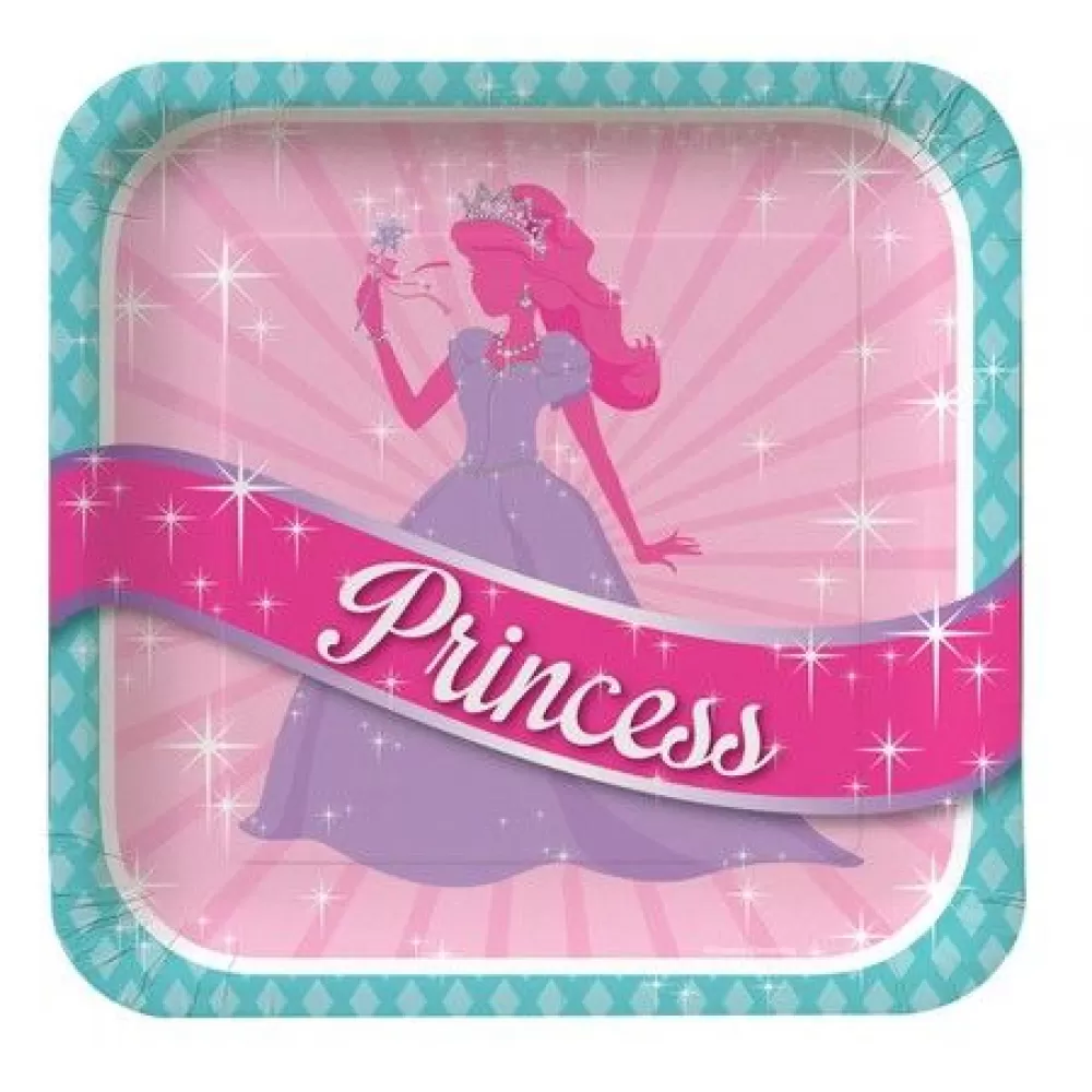 - Тарелки одноразовые бумажные для праздника с принцессами. В наборе 8 фольгированных квадратных тарелок, размер тарелки 17 см.