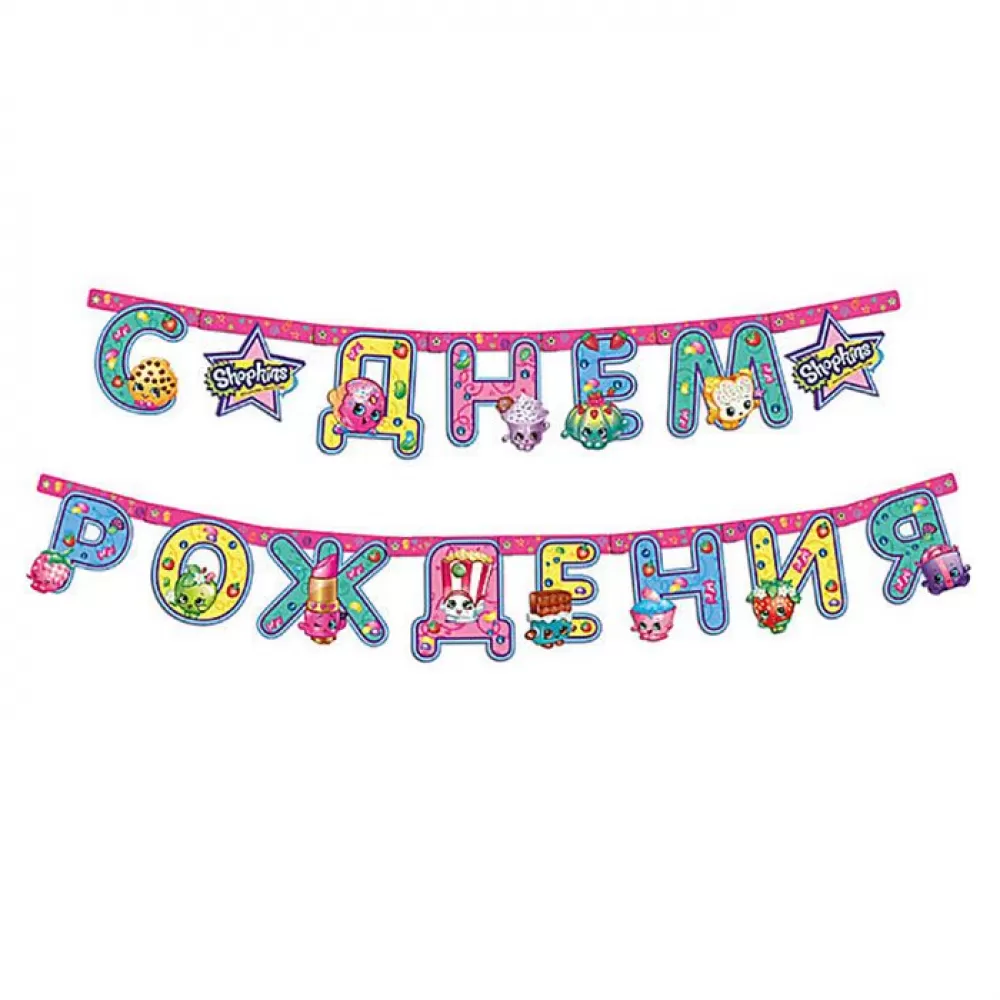 - Гирлянда «Шопкинс» C Днем Рождения из бумаги, длина гирлянды 2,5 м, высота букв 14 см.