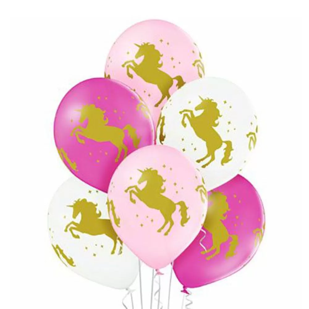 - В наборе 10 шаров белых, розовых и темно-розовых цветов с изображением золотого Единорога.