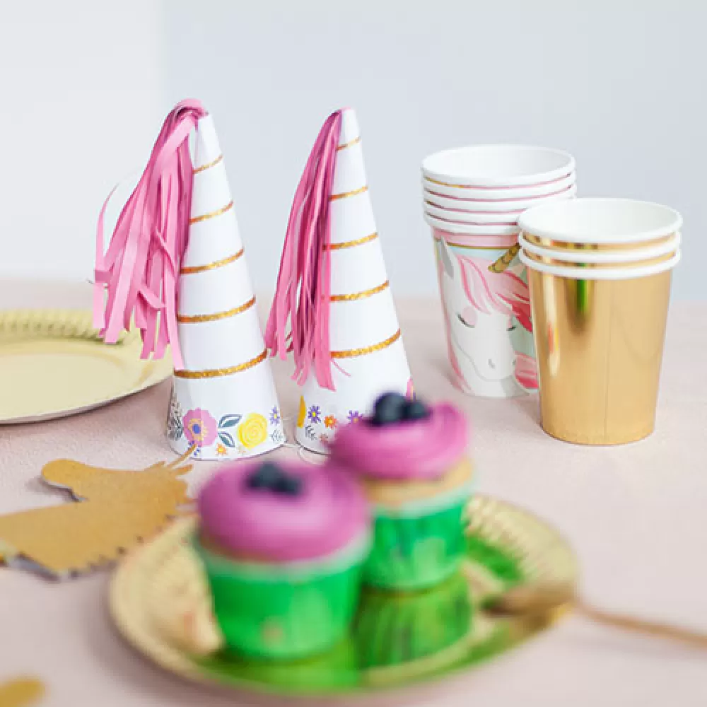 - Милые колпачки идеально подходят для Unicorn Party - они украшены тонкими золотыми полосками, кисточками и красивыми нежными цветами и очень похожи на настоящий рожок. Белые колпачки, которые выглядят как рога единорога, станут отличным дополнением к тематической вечеринке.