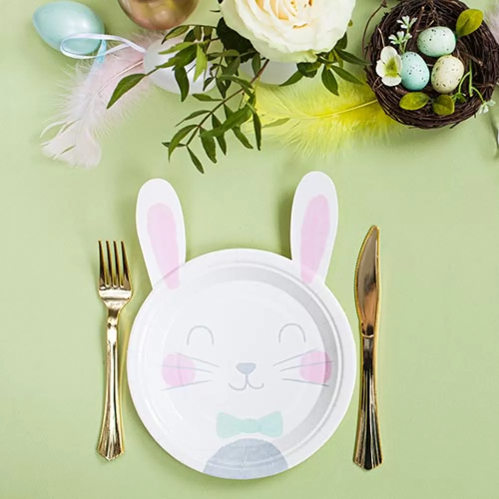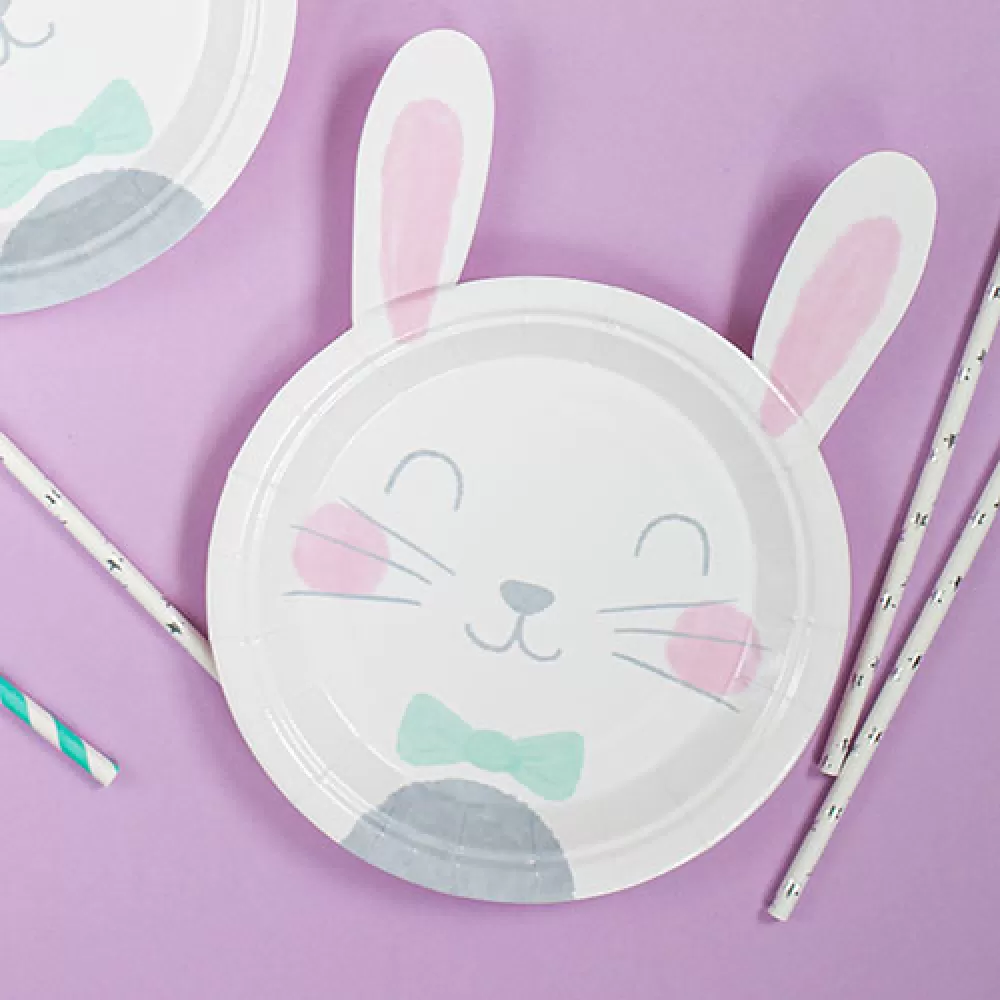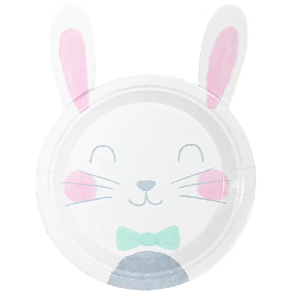 - Одноразовые бумажные тарелки Зайчик, фигурные тарелки в виде милого зайки с ушками.