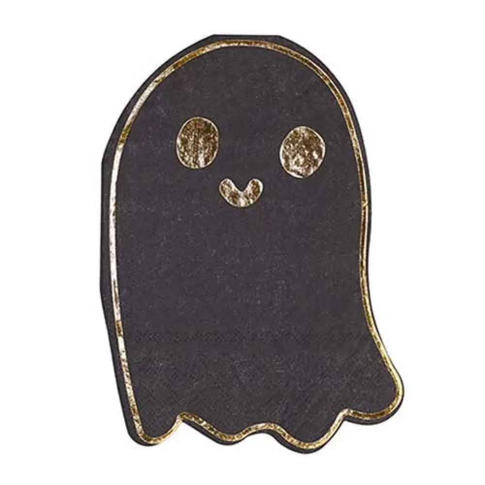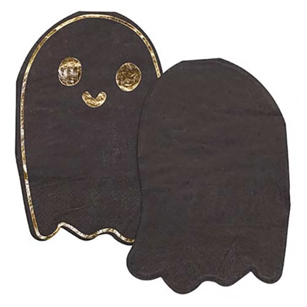 - Стильные салфетки в форме привидения черного цвета с золотым фольгированным тиснением. Для оформления вечеринки Halloween вы можете выбрать стаканы, колпачки и гирлянды из коллекции в черных и золотых цветах.