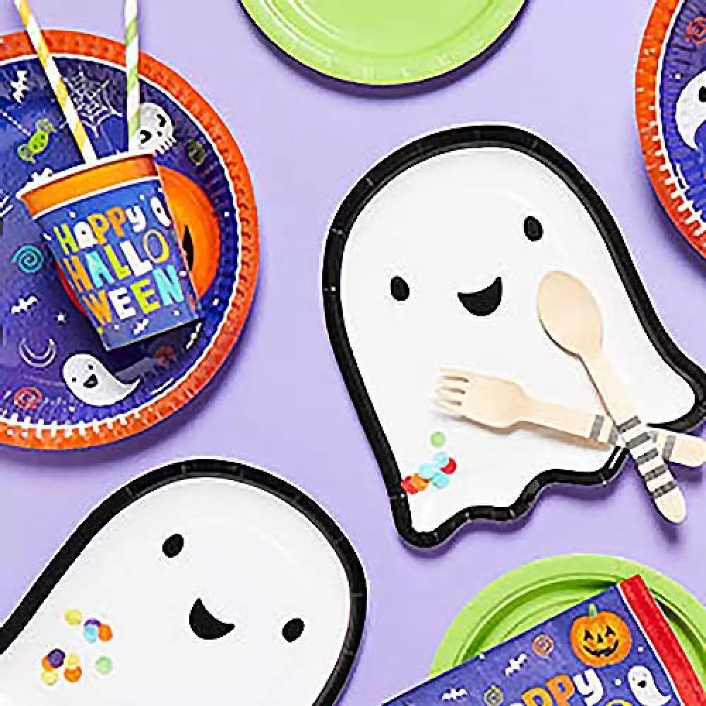 - Для сервировки стола на вечеринку Halloween вы можете выбрать одноразовую бумажную посуду, салфетки и гирлянды из коллекции в классических оранжевых, фиолетовых и черных цветах.