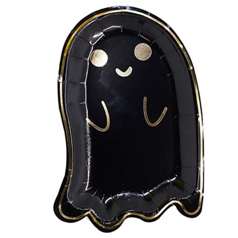 - Стильная тарелка в форме привидения черного цвета с золотым фольгированным тиснением. Для сервировки стола на вечеринку Halloween вы можете выбрать стаканы, салфетки и гирлянды из коллекции в черных и золотых цветах.