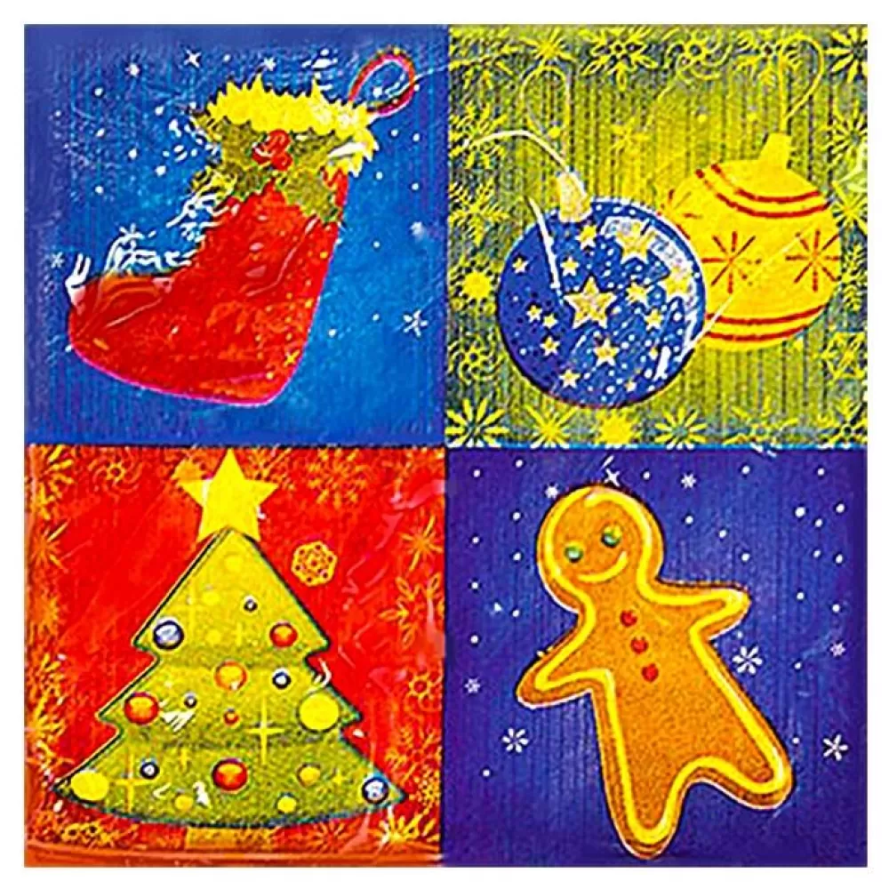 - Салфетки в коллажном стиле с имбирным человечком, елочными игрушками, сапожком для подарков и елкой! Счастливого Нового года и Рождества!