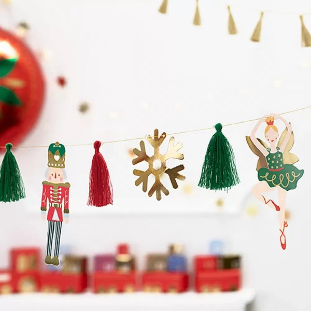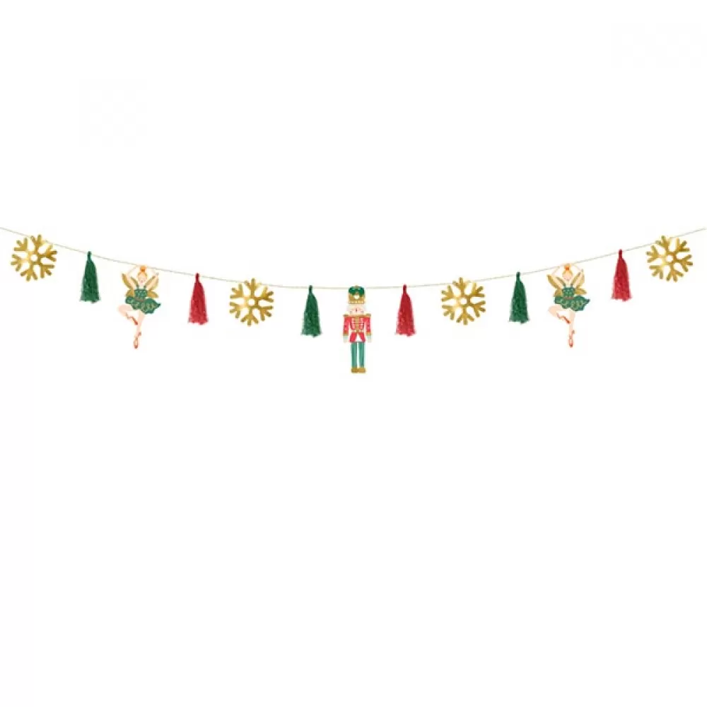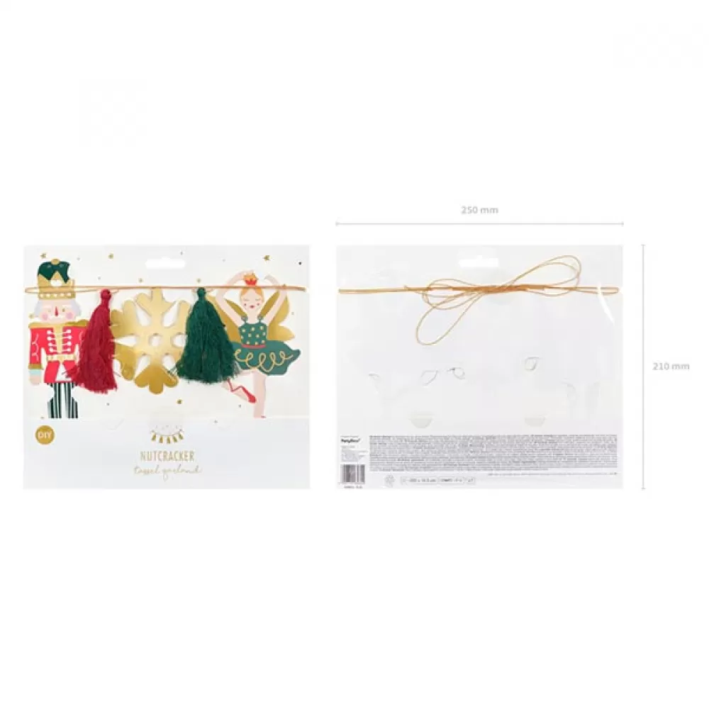 - Новогодняя гирлянда с фигурками Щелкунчика и балерины и подвесками - снежинками и красными и зелеными кисточками тассел.