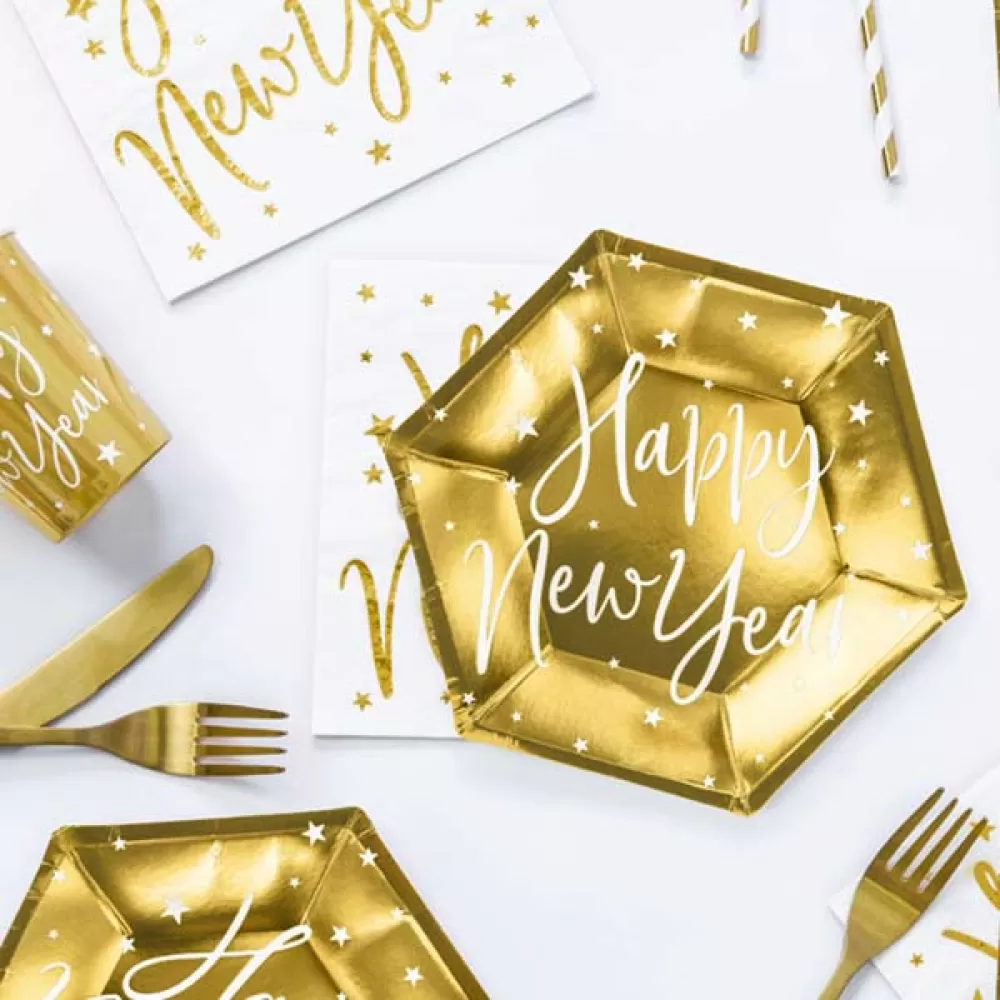 - Одноразовые бумажные золотые тарелки Happy New Year в форме шестиугольника.